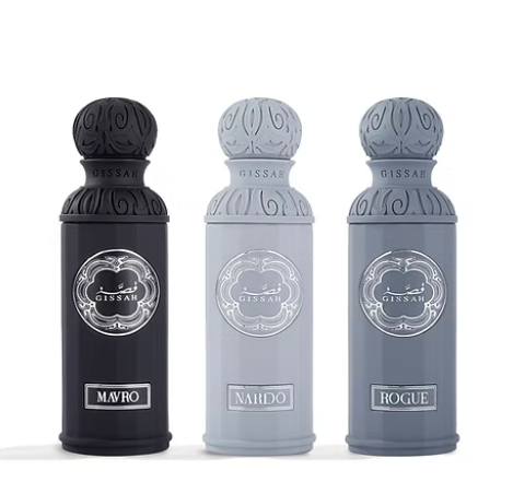 Gissah Graphite Set features Mavro, Nardo, and Rogue in three 50ml bottles, delivering a bold and refined fragrance collection.